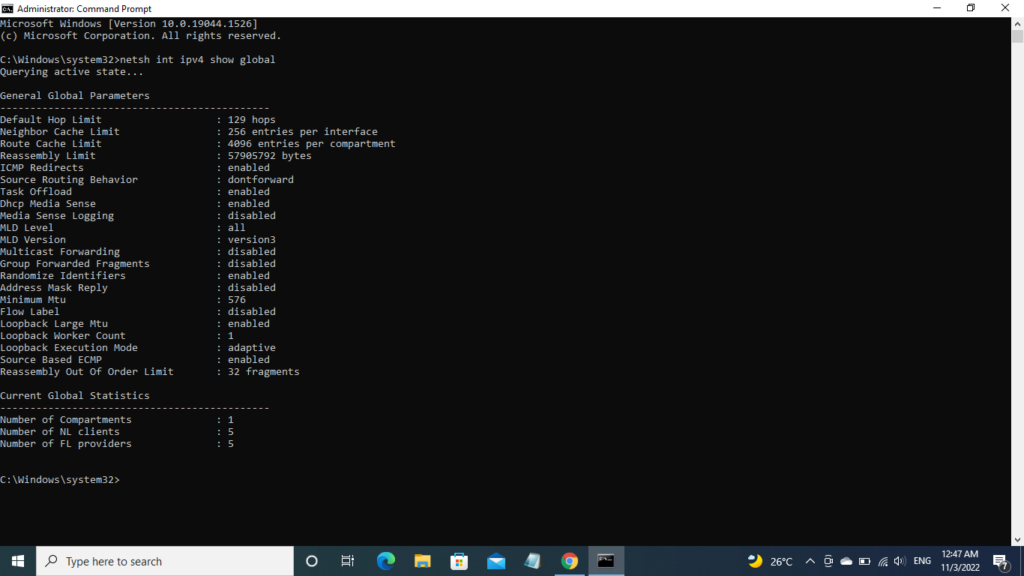 - Seterusnya boleh taip code ini : netsh int ipv4 show global